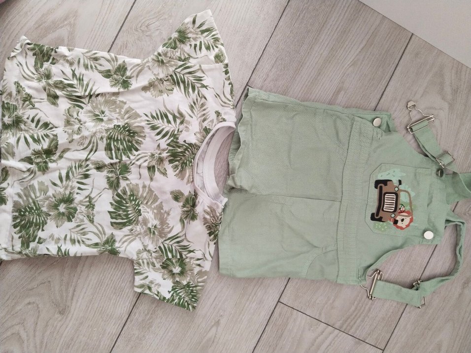 Kısa kollu, bisiklet yakalı yaprak desenli üst ve pastel yeşil şortlardan oluşan erkek bebek sokak stili takımı.