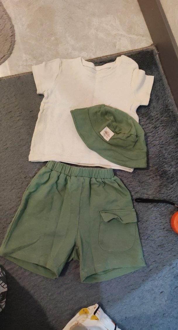 Kısa kollu krem üst, cep detaylı açık yeşil şort ve uyumlu şapka içeren, yumuşak ve sıcak kumaştan bebek takımı.
