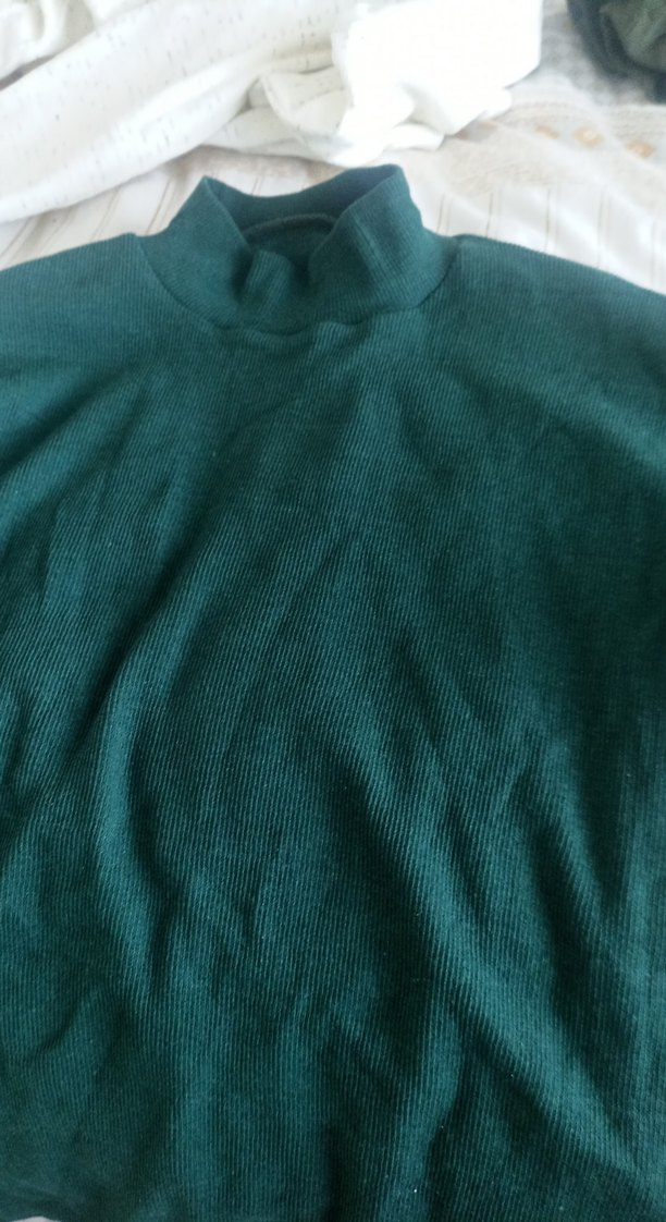Yeşil renkli, boğazlı ve uzun kollu, rahat kesim triko kazak. Yumuşak keten kumaştan, parlak görünümlü ve midi uzunlukta, günlük kullanım için uygundur.