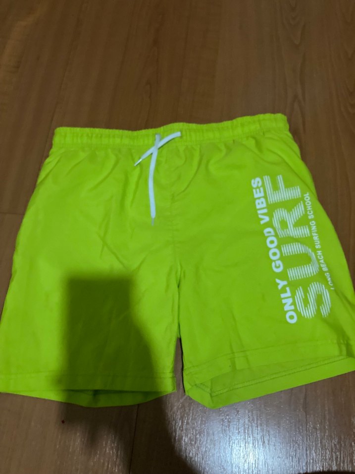 Canlı yeşil renkli, elastik bel bantlı ve yan tarafında baskılı yazı bulunan erkek çocuk deniz şortu. Rahat kullanım sağlar.