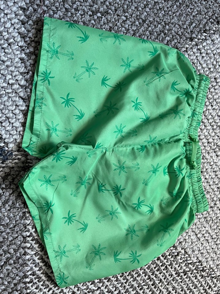 Yeşil renkli, mini boy, bol kesim erkek deniz şortları, düğmeli detaylı ve parlak yüzeye sahip. Plajda rahat kullanım için uygun, retro bohem tarzında.