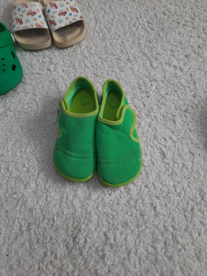 Yeşil renkli, Velcro bantlı, lastik malzemeden erkek çocuk terliği. Renkli, desen içermeyen sade tasarım. Rahat kullanım sağlar.