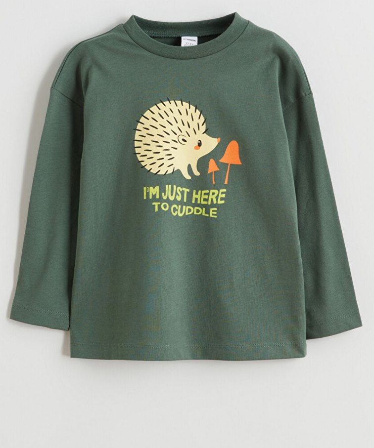 Uzun kollu, bisiklet yaka, bol kesim erkek çocuk sweatshirtü. Yumuşak ve örme dokulu kumaştan, üzerinde "I'M JUST HERE TO CUDDLE" yazılı kirpi baskısı bulunur. Yeşil ve gri tonlarında.
