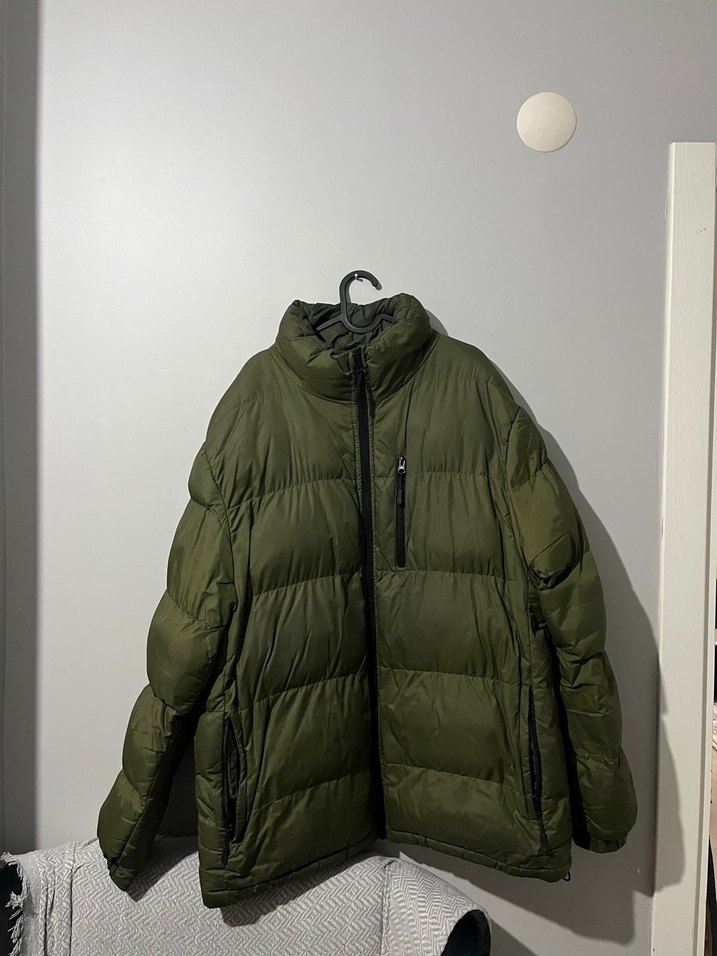 Koyu yeşil, fermuarlı cepli ve yüksek yakalı, yumuşak ve sıcak kumaştan yapılmış, normal boyda, dar kesim erkek mont. Dış mekan kullanımı için uygundur.