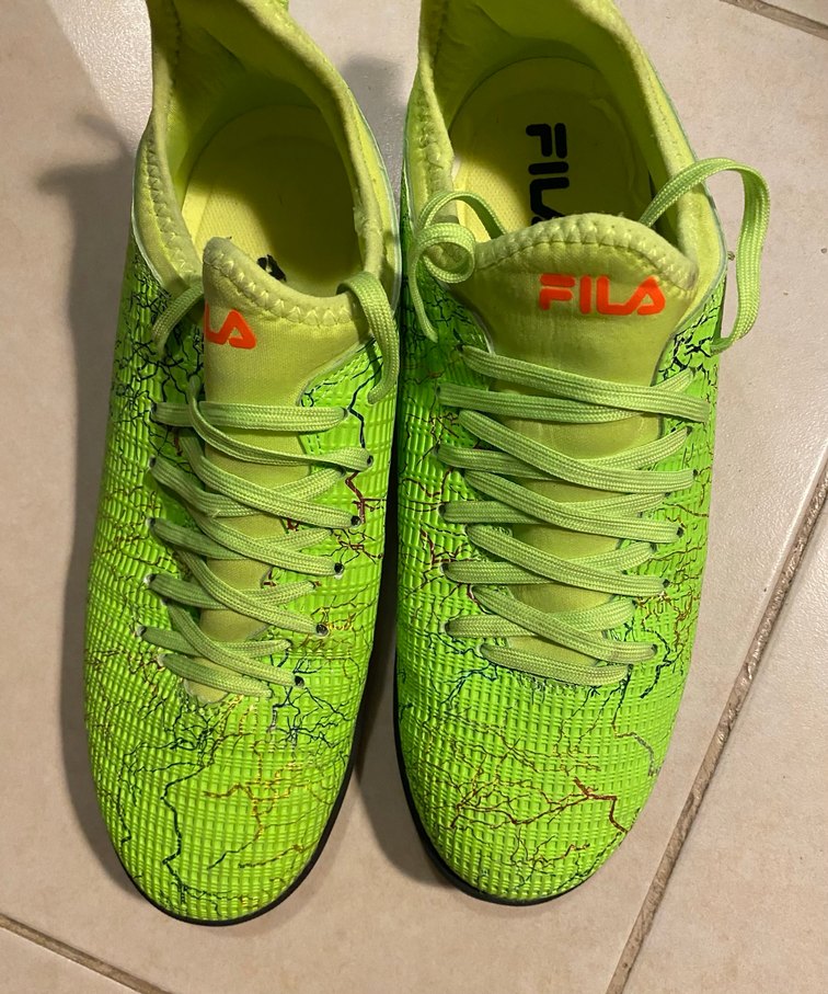 FILA markalı, velcro detaylı yeşil erkek futbol ayakkabısı. Spor ve sokak stili için uygun, kaymaz kauçuk tabanlı, renkli ve desensiz tasarım. ⚽