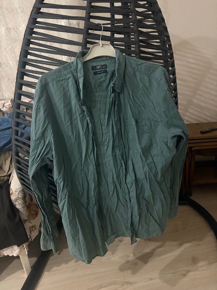 Yeşil erkek gömlek, bol kesim ve uzun kollu. Yaka kısmı yakalı ve düğmeli, günlük rahat kullanım için uygundur.