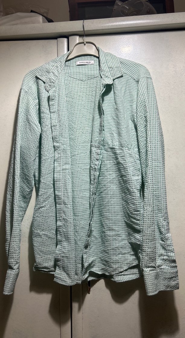 Yeşil keten kumaştan, düğmeli ve uzun kollu, notched lapel yakalı, salaş kesim midi uzunlukta erkek gömleği.