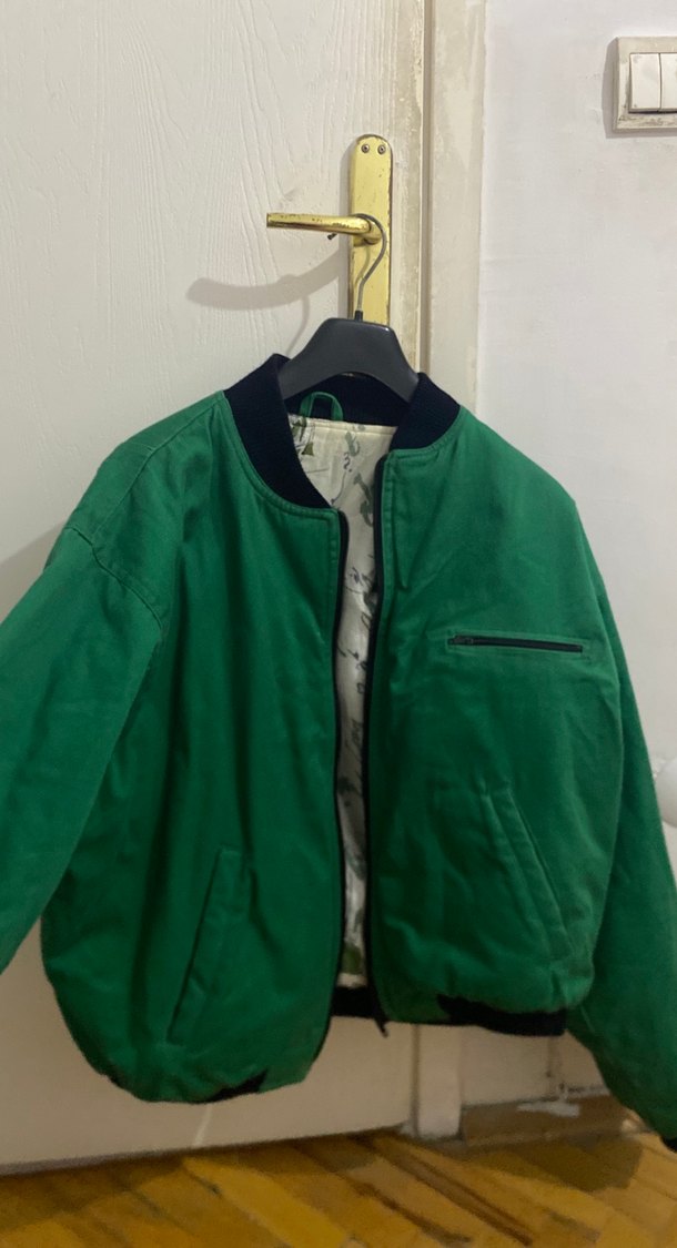 Yeşil renkte, bol kesim midi boy erkek ceket. Uzun kollu, kesik yaka ve fermuarlı ceplere sahip. Sentetik kumaştan, günlük kullanıma uygun.