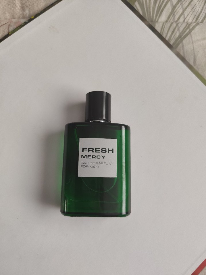 Yeşil şişede Fresh Mercy etiketli erkek parfümü, ferah bir koku sunar, minimalist ve karşı kültür tarzında.