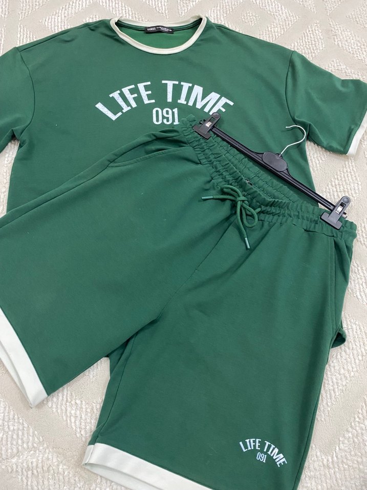 Yeşil renkli, kısa kollu, bol kesim erkek şort takımı. Şortları kemerli ve üzerinde 'LIFE TIME 091' baskısı bulunur. Sentetik kumaştan üretilmiştir.