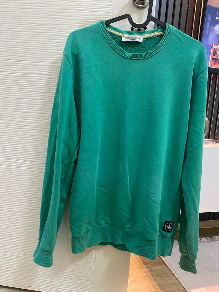 Yeşil renk, bisiklet yaka ve uzun kollu erkek sweatshirtü. Salaş kesim ve normal boyda, yumuşak ve sıcak kumaştan üretilmiştir. Parlak yeşil rengiyle rahat ve şık bir görünüm sunar.