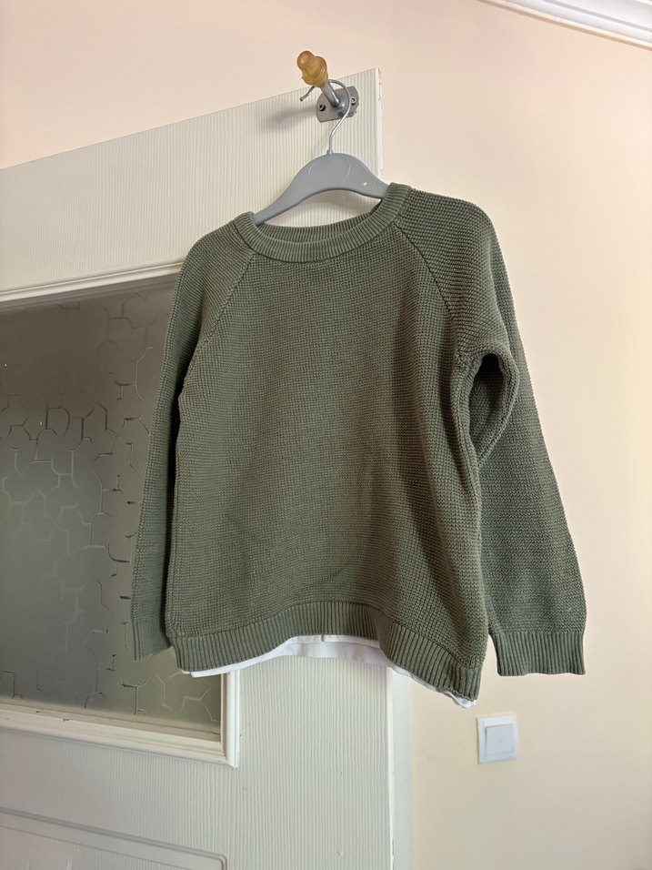 Yeşil renkli, yuvarlak yaka ve uzun kollu, bol kesim kız triko sweatshirt. Düz ve desensiz, rahat bir normcore tarz sunar.