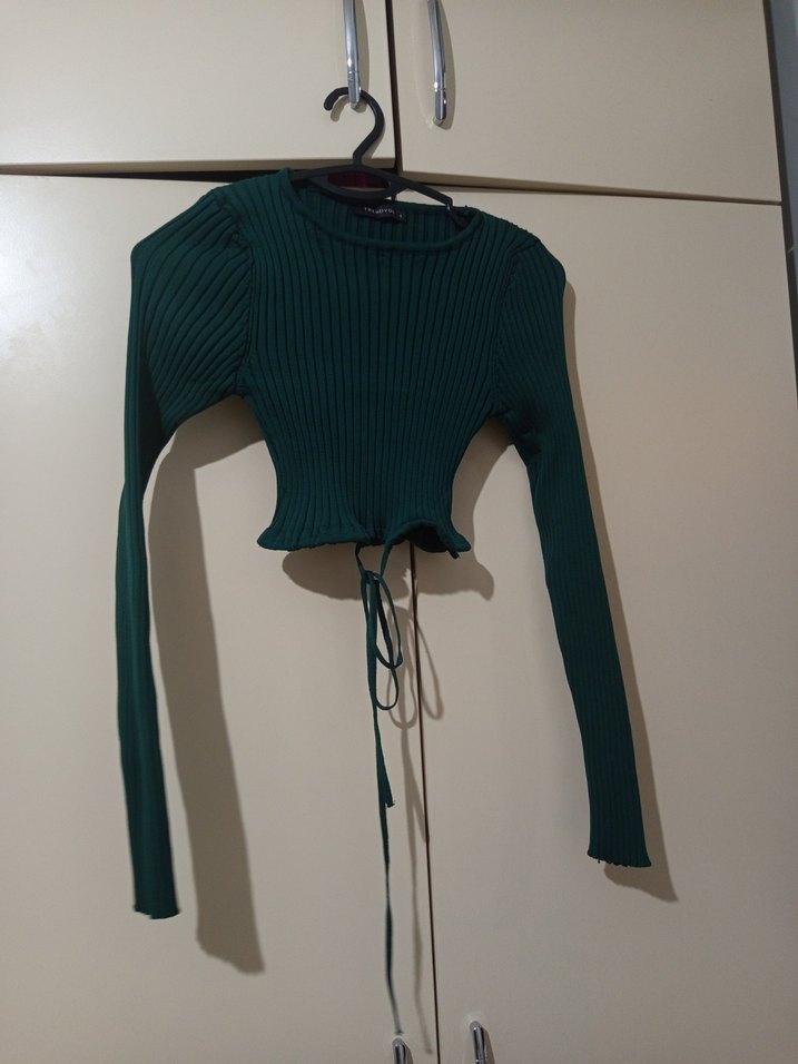 Koyu yeşil renkte, balıkçı yaka ve uzun kollu, fitilli örme kumaştan yapılmış üst belden bağlama crop alttan dar bedene yapışık etek