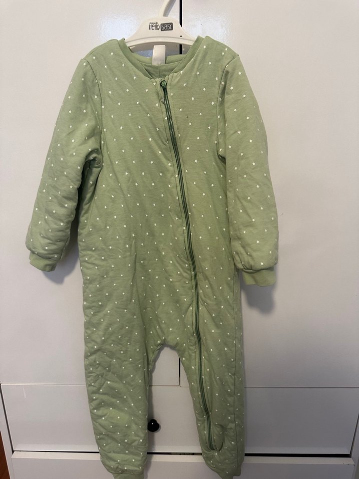 Pastel yeşil renkte, fermuarlı ve yumuşak, sıcak dokulu kumaştan yapılmış, hafif benekli bebek tulumu.