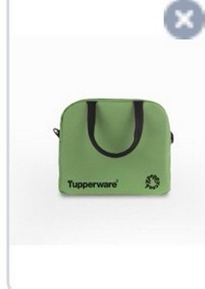 Pastel yeşil renkli, fermuarlı ve siyah saplı beslenme çantası. Minimalist Tupperware logosu ile günlük kullanıma uygun.