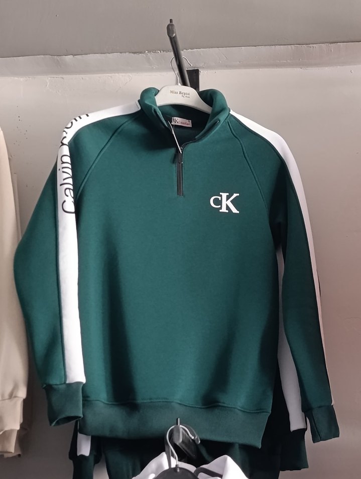 Uzun kollu, fermuarlı ve bisiklet yaka erkek sweatshirt. Yumuşak fleece kumaştan, koyu yeşil renkte, kollarda beyaz baskılı şerit ve göğüste cK logosu bulunur. Spor ve sokak tarzına uygun. ♂️