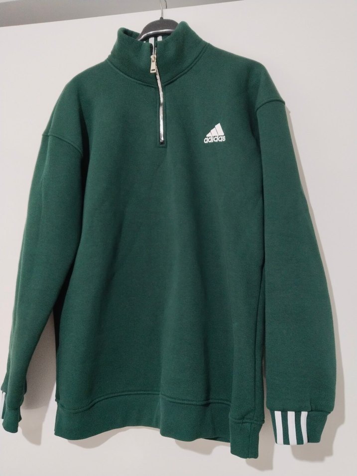 Koyu yeşil renkte, fermuarlı yüksek yakalı erkek sweatshirt. Uzun kollu, bol kesim ve yumuşak, sıcak tutan kumaştan yapılmıştır. Günlük kullanım için uygundur.