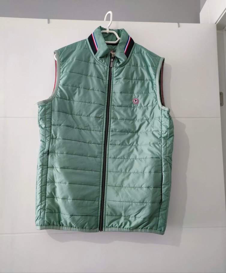 Yeşil parlak sentetik kumaştan, fermuarlı, erkek yelek. Klasik yaka ve midi boy, rahat kesimdir. Günlük ve spor tarz için uygundur.