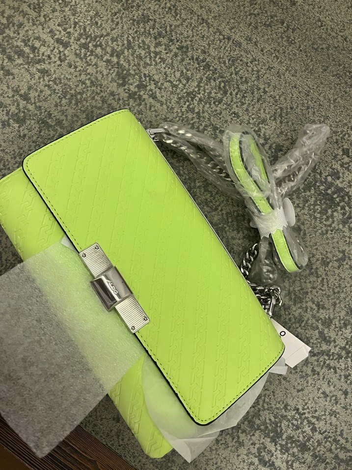 Sentetik kumaştan yapılmış, fermuarlı ve baskılı desene sahip açık yeşil kadın çantası. Günlük kullanıma uygun, çağdaş minimalist tarzda.
