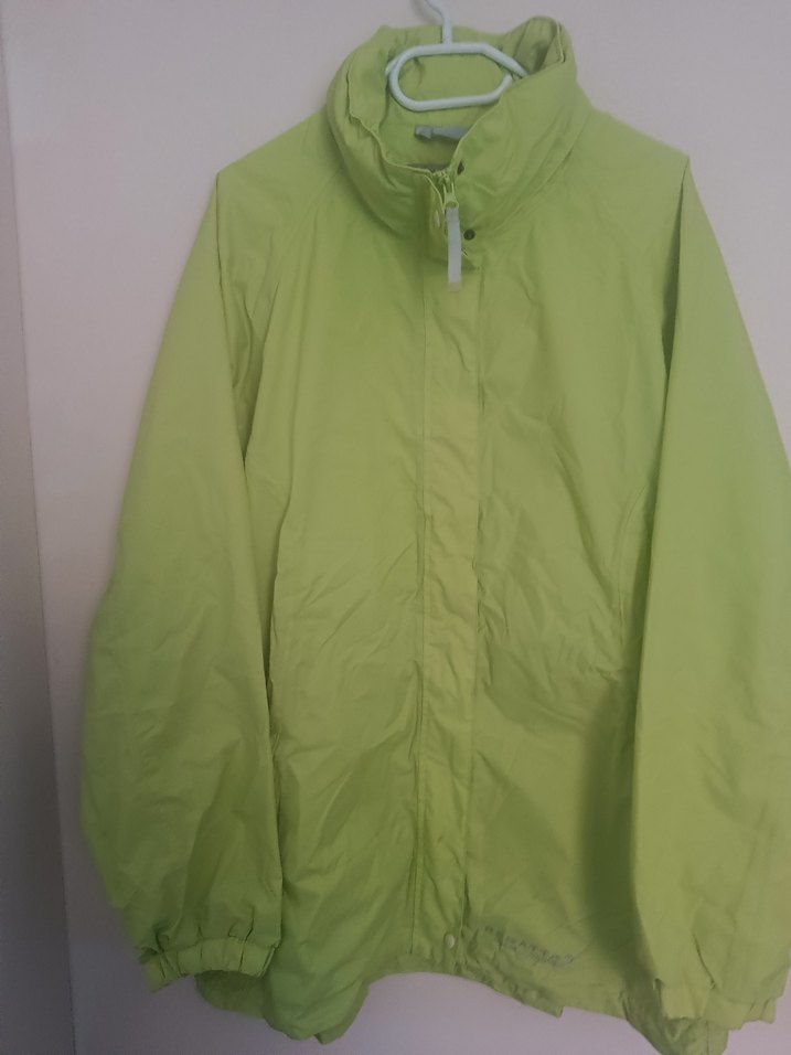 Yeşil renk, fermuarlı, yüksek yakalı ve uzun kollu rahat kesim kadın ceketi. Parlak görünümlü, dış mekan kullanımı için uygundur. önünde küçük leke var en 65 cm boy 73 cm