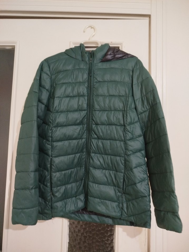 Yeşil renkli, fermuarlı ve ince kesim kadın kışlık mont. Sentetik kumaştan, uzun kollu ve rahat bir sokak stili sunar.