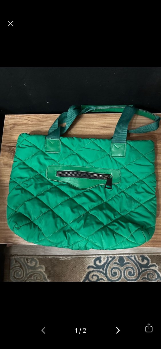 Parlak yeşil sentetik kumaştan, fermuarlı cepli, sokak stili ve günlük kullanım için uygun kadın omuz çantası.