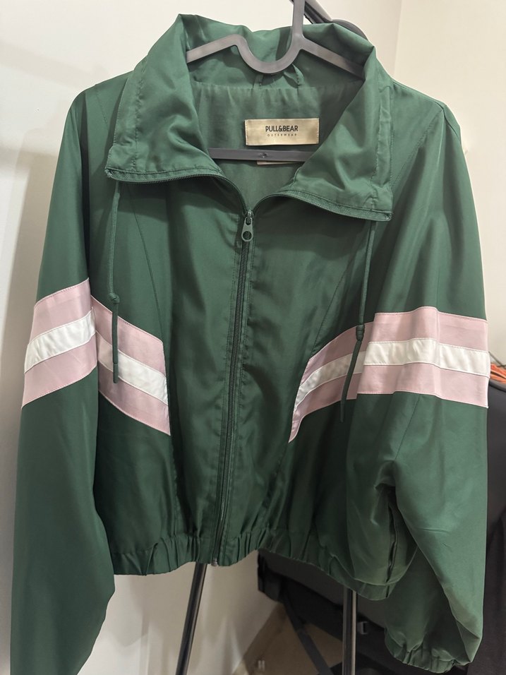 Parlak yeşil renkte, yüksek yakalı, uzun kollu ve fermuarlı ön kısmı olan kadın yağmurluğu. Salaş kesim ve midi boyda, spor sokak stili için uygundur. Kollarda pembe ve beyaz çizgiler bulunur, sentetik kumaştan yapılmıştır.