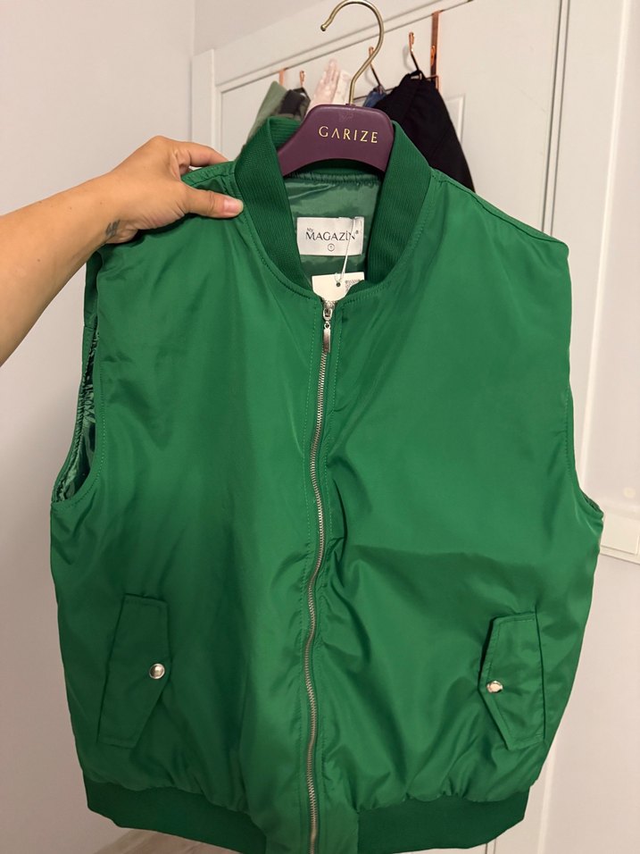Yeşil, fermuarlı, bisiklet yaka ve kolsuz kadın yelek. Rahat kesimli Sıfır etiketlidir