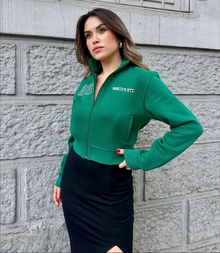 Sıfır üründür S,M beden vardır Bu yeşil, fermuarlı kısa bomber ceket, yüksek yakalı ve uzun kolludur. Yumuşak, sıcak kumaştan yapılmış ve baskılı detaylara sahiptir.