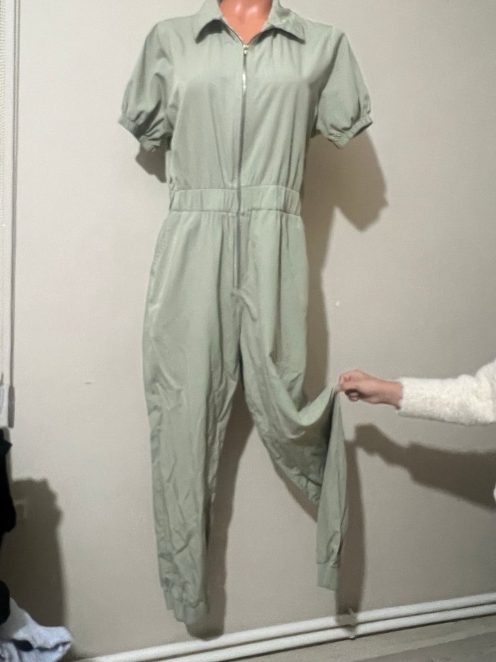 Yeşil renk, kısa kollu, yüksek yakalı, fermuarlı, rahat kesim tulum. Yumuşak sentetik kumaştan üretilmiştir, günlük kullanıma uygundur.