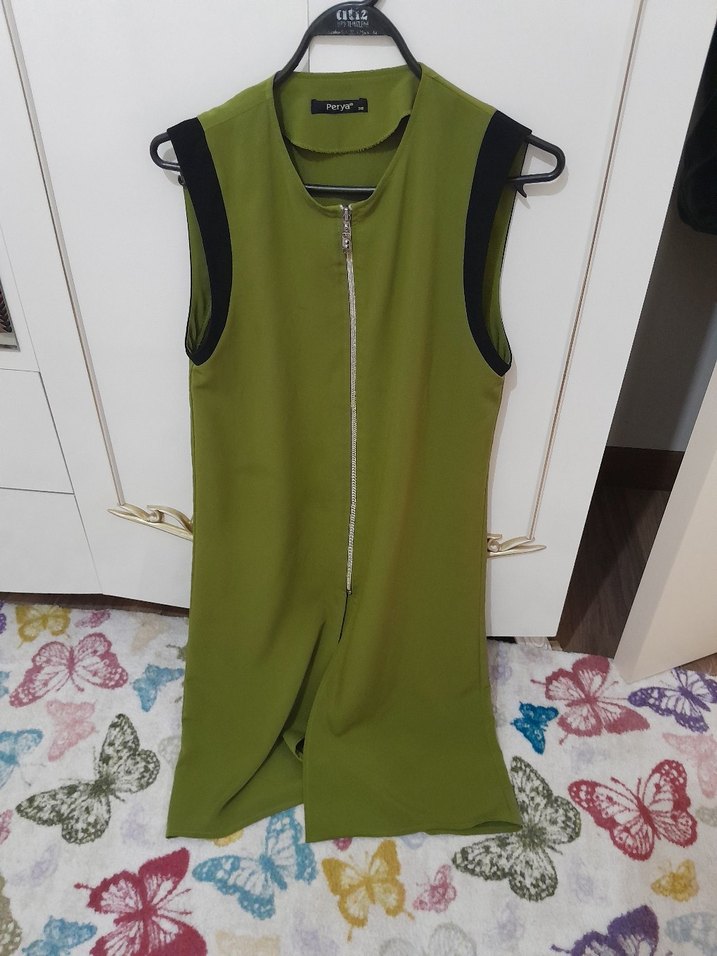 Kolsuz, fermuarlı ve straplez yakalı yeşil yelek, sentetik kumaştan üretilmiştir. Sokak modasına uygun, günlük kullanıma ideal.
