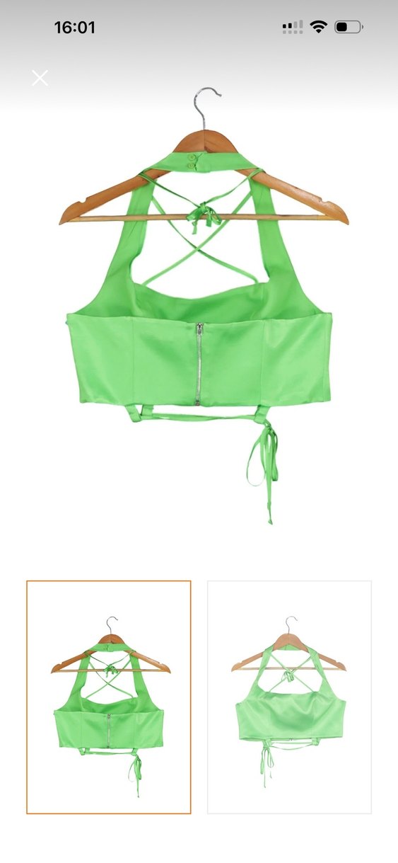 Yeşil, fermuarlı ve straplez kesime sahip bu bustiyer, ince askılı detaylarla tasarlanmıştır. Sentetik kumaştan üretilmiş, kısa ve dar kesimdir. Ve pantolon ikili takım renkler aynı sadece ışıktan dolayı renk farklı