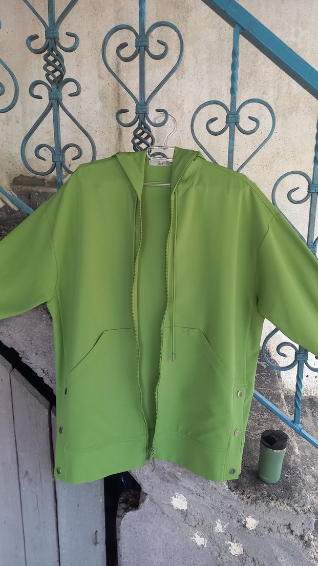 Parlak yeşil renkli, fermuarlı, rahat kesim ceket. Uzun kollu, yuvarlak yakalı ve normal midi boyda, yumuşak ve sıcak kumaştan üretilmiştir. Günlük kullanıma uygun, spor ve rahat tarzda.