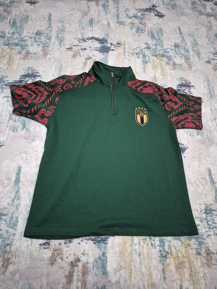 Yeşil renkte, kısa kollu, fermuarlı yarım boğazlı, baskılı kollara sahip, bol kesim erkek tişörtü. Günlük kullanıma uygun rahat ve trend bir tasarım. italya forması