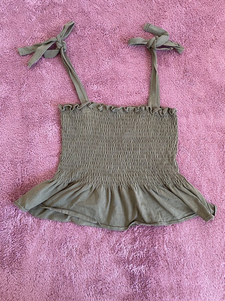 Yeşil kumaştan, askılı ve fırfırlı detaylı, bol kesim bohem tarzda bluz.