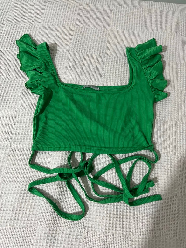 Koyu yeşil renkli,halter yaka tasarımlı crop top. Sentetik kumaştan, kısa ve vücuda oturan kesimde, streetwear ve athleisure tarzına uygun.