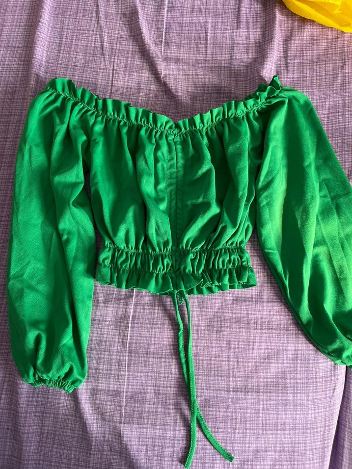 Yeşil renkli, kayık yaka ve fırfırlı detaylara sahip kadın bluz. Uzun kollu, lastikli manşetli ve nefes alan keten kumaştan yapılmıştır. Rahat ve parlak görünüm sunar.
