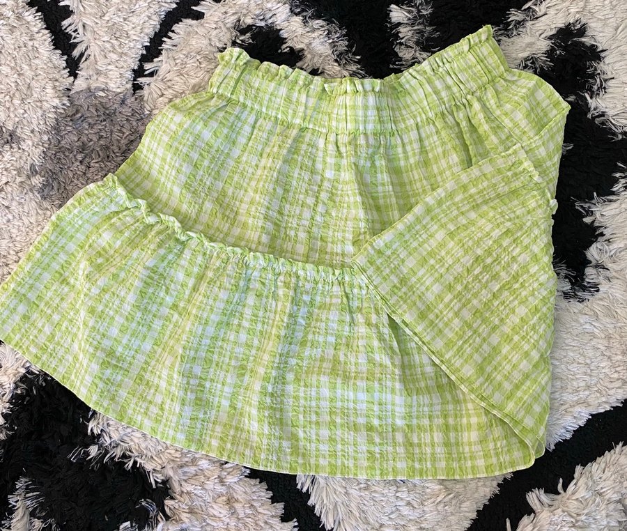 Pastel yeşil renkte, keten kumaştan, bol kesim ve fırfırlı detaylara sahip mini etek. Tie-dye desenli, bohem tarz için uygun.