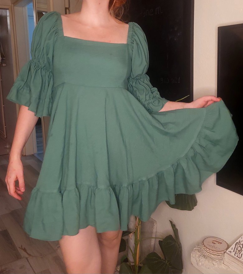 Pastel yeşil midi elbise, yumuşak keten kumaştan, bol kesim ve fırfır detaylıdır. Kare yaka ve askılı kollu, bohem tarzıyla romantik akşamlar için uygundur.