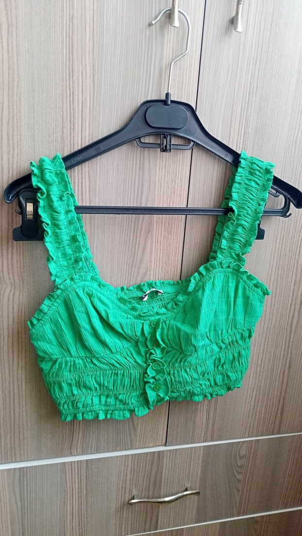 Yumuşak keten kumaştan yapılmış, yeşil renkli, fırfırlı detaylara sahip, askılı kısa bustiyer. M beden