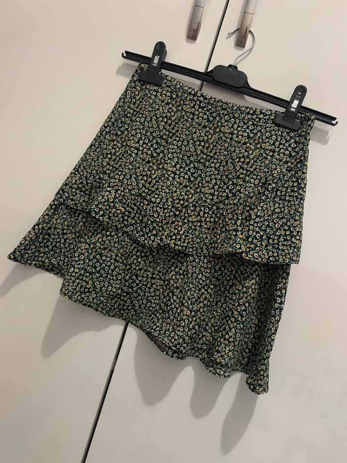 Koyu yeşil tonlarında, bol kesimli ve fırfır detaylı, bohem tarzda mini etek, günlük kullanım için uygundur.