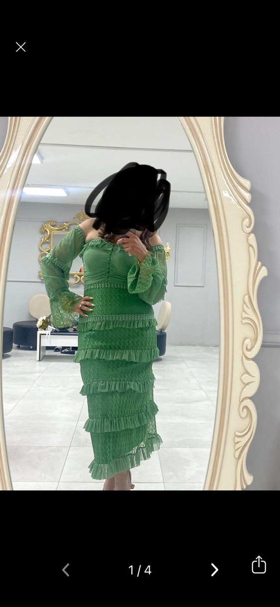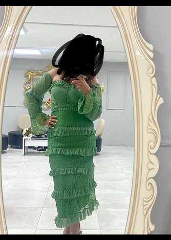 Parlak yeşil işlemeli sentetik kumaştan, fırfırlı detaylı, straplez ve ince askılı, fit kesim uzun elbise, parti için uygun.