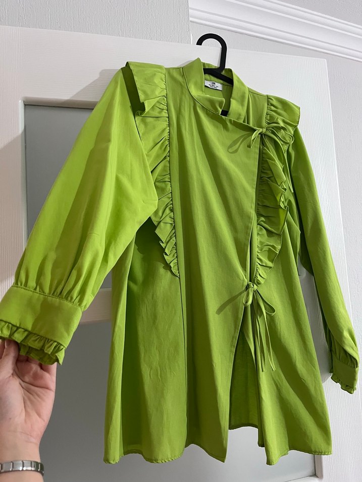 Sadece bitmez giyildi 38 40 42 beden uyumlu bağlamalı bağlamadan da içine tişörtle giyiliyor butikten alındı Parlak yeşil renkte, keten kumaştan uzun kollu, yüksek yakalı ve bol kesim bir bluz. Ön ve kol manşetlerinde fırfır detayları bulunuyor