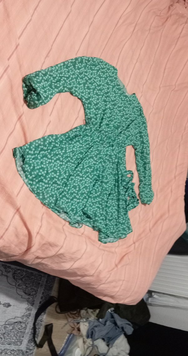 Yeşil, uzun kollu, V yaka, fırfır detaylı, salaş kesim, pastel tonlarda batik desenli, yumuşak sentetik kumaştan bohem tarzda elbise. m l beden tunik olarak 1 defa düğünde giydim