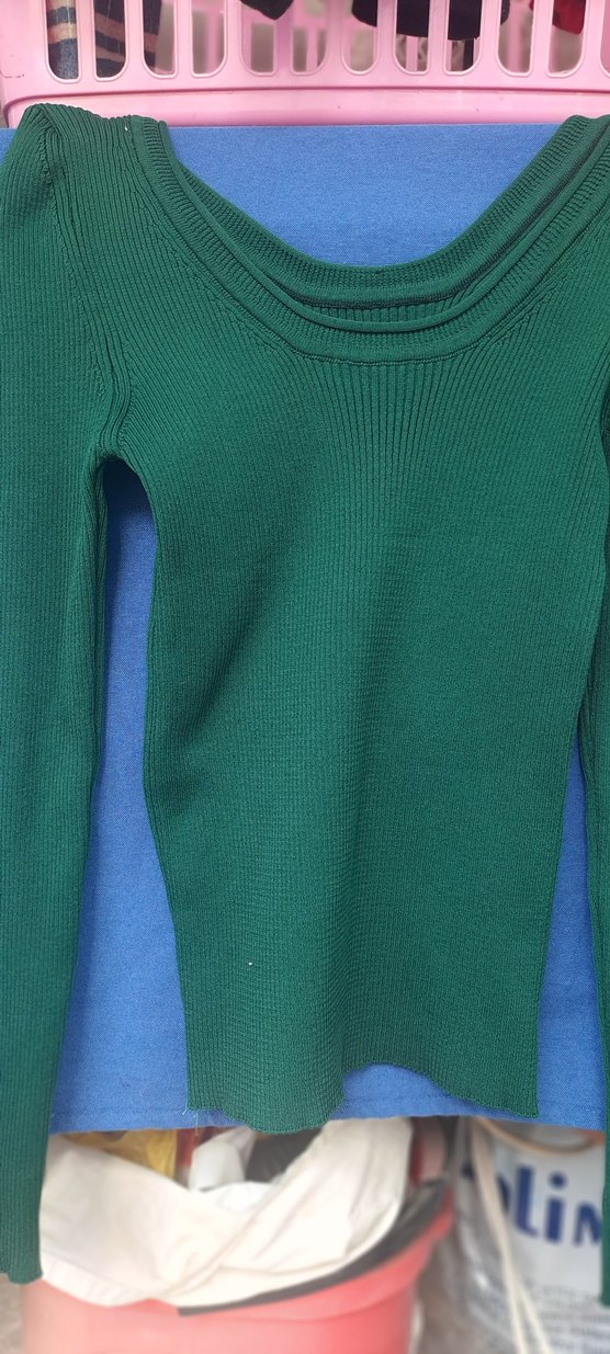 Fitilli yeşil kadın kazak, boğazlı ve uzun kolludur. Örgü görünümlü sentetik kumaştan yapılmış, desen içermeyen, midi uzunluğunda rahat bir parçadır.