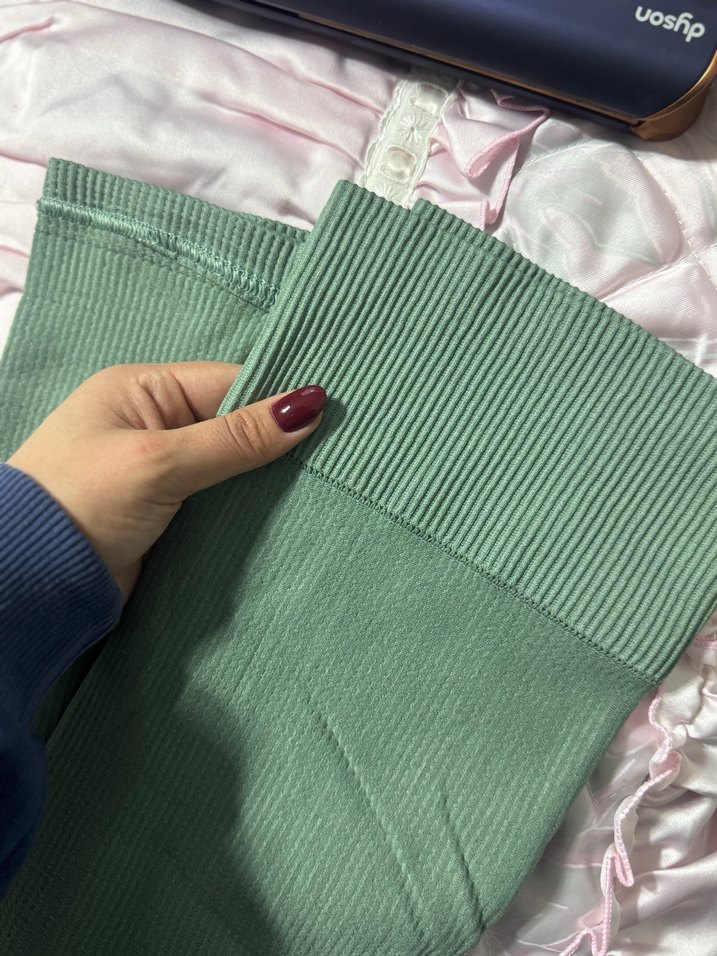 Sentetik kumaştan yapılmış, fitilli dokulu yeşil , vücuda oturan midi boy kadın tayt. Günlük ve sokak stiline uygun.