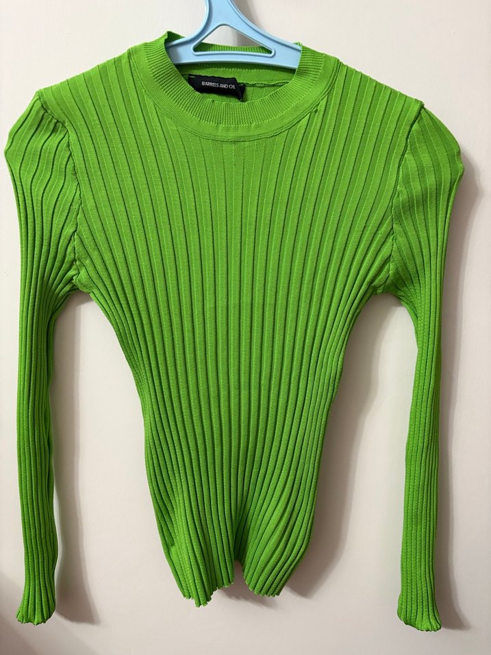 Yeşil renkte, fit kesim, uzun kollu ve yuvarlak yaka kadın kazak. Triko dokuma ve sentetik kumaştan yapılmıştır, gündelik kullanıma uygundur.