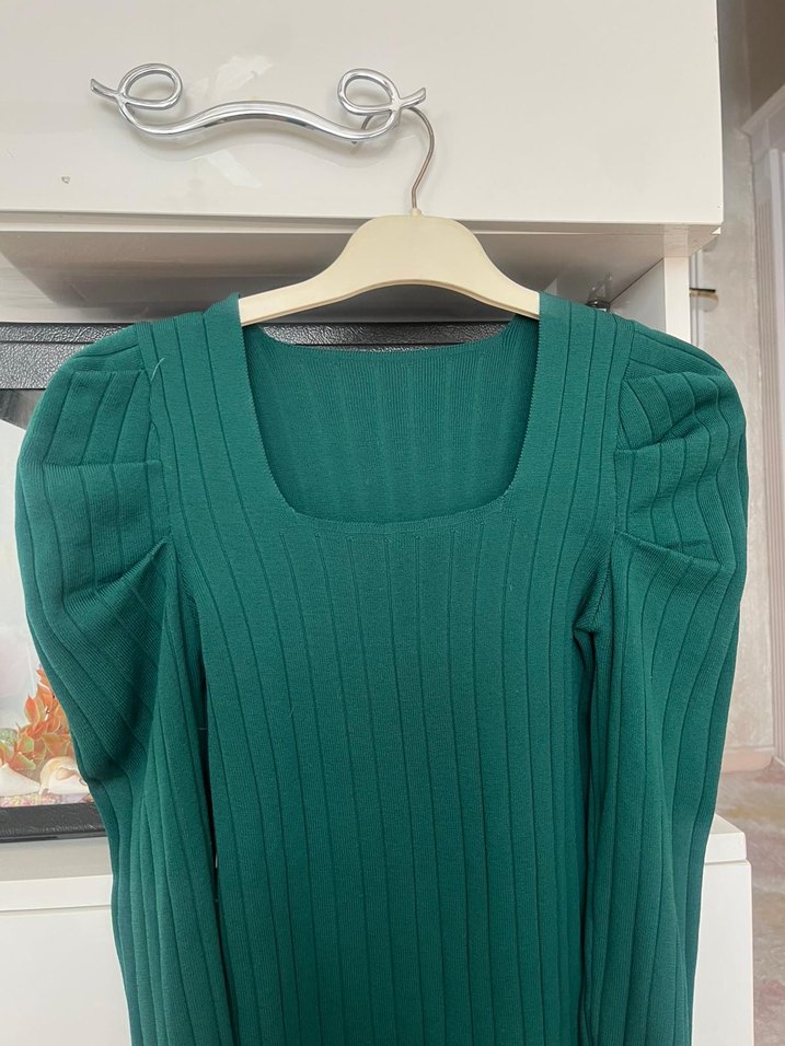 Koyu yeşil fitilli kumaştan, pileli uzun kollu ve kare yakalı, rahat ve şık günlük kullanım için uygun kadın kazak.
