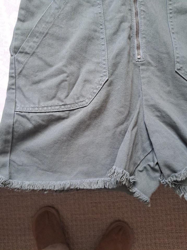 yeşil gabardin kumaştan, V yakalı ve kısa kollu, önden fermuarlı, salaş kesim kadın kısa tulum. Püsküllü etek ucu ile günlük tarz için uygun.