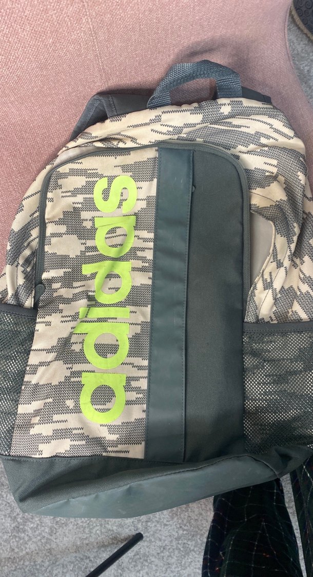 Adidas marka, yeşil ve gri desenli sırt çantası. Yanlarda file cepler ve taşıma için üst tutma sapı bulunur. Kusurları görselde mevcut. Orijinaldir
